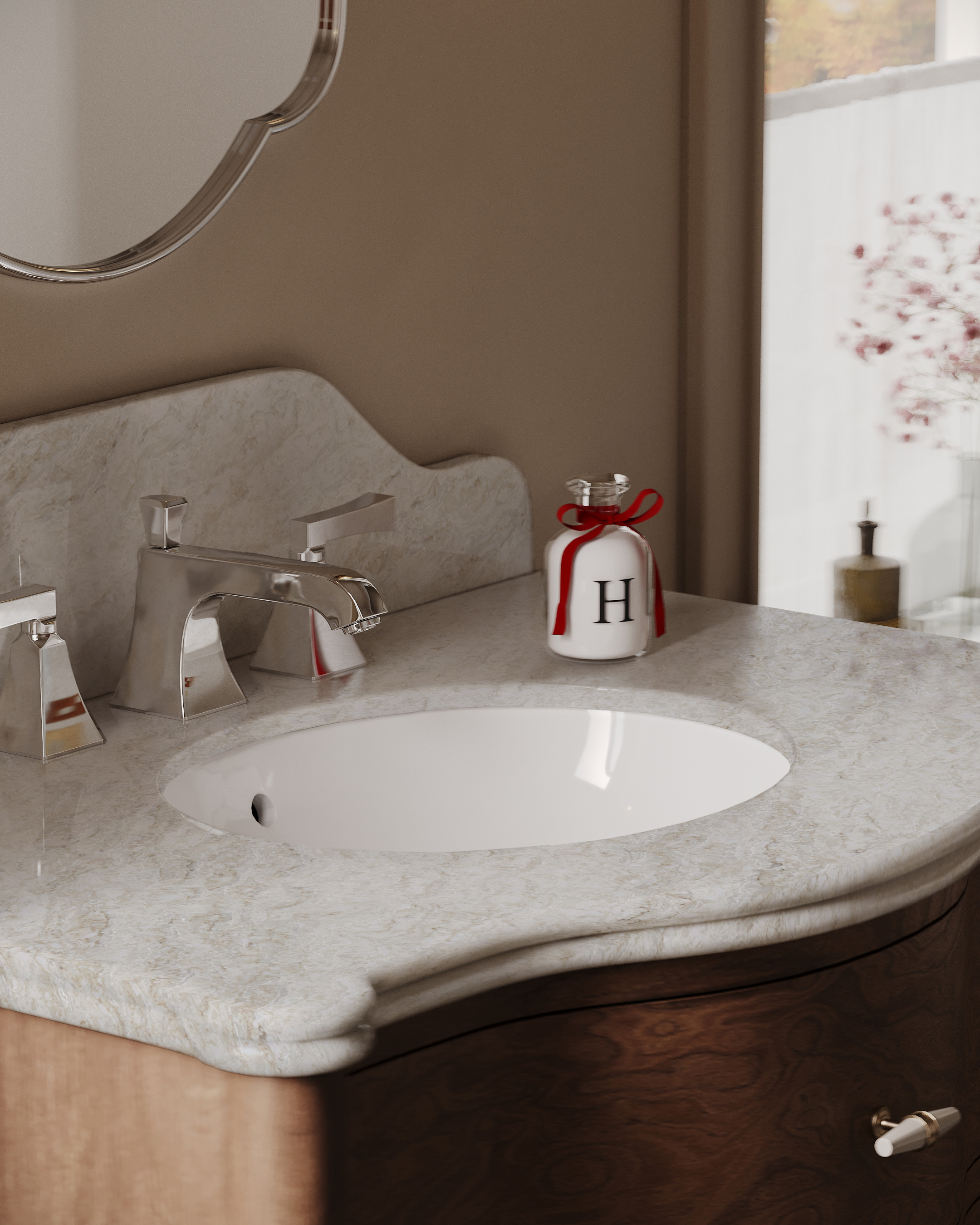 The vanity sets the tone for the entire bathroom. Using Avora on the countertop introduces gentle movement and warmth, creating a focal point that feels refined yet approachable.